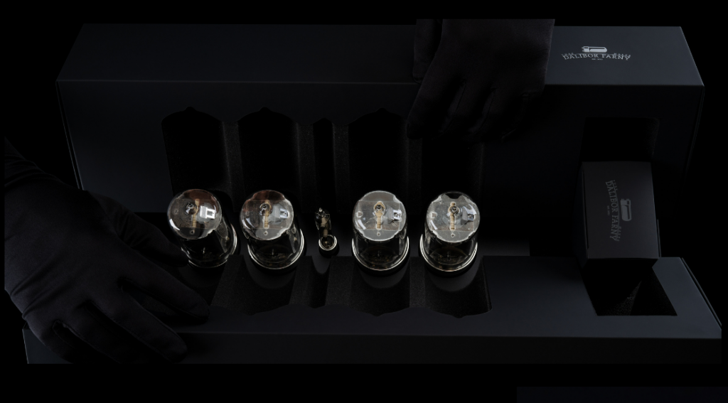 Pěna obkreslující povrch celých hodin s výsekem na obálku s návodem, záručním listem a fotografiemi z výroby hodin. To vše je ukryto na pohled zvenší v černé tvrdé papírové krabici s logem.